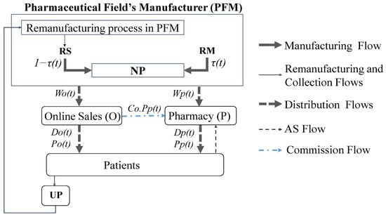 - Only the pharmacy (P) provides AS for returned products sold in both channels in return for a commission on each sale from the online platform (O). The manufacturer (M) determines the unit sales commission Co between both channels