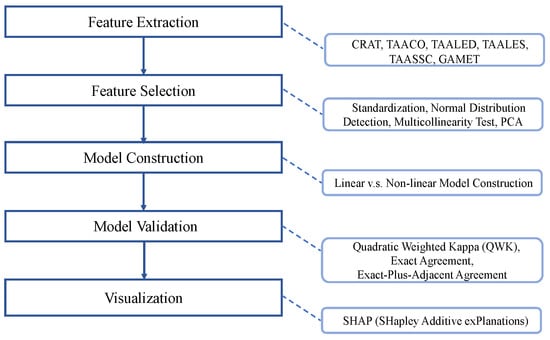 All the essays were processed with advanced computational analytic tools, including Constructed Response Analysis Tool (CRAT) [99], Tool for the Automatic Analysis of Lexical Diversity (TAALED) [100], Tool for the Automatic Analysis of Lexical Sophistication (TAALES) [66], Tool for the Automatic Analysis of Syntactic Sophistication and Complexity (TAASSC) [101], Tool for the Automatic Analysis of Cohesion (TAACO) [53,102], and GAMET [103]. Linguistic features pertinent to various dimensions of writing quality were extracted using specific tools selected for several key reasons: First, their public accessibility and cost-free nature made them highly accessible. Second, the ease and speed with which these tools can be downloaded and operated provided unmatched convenience for selecting features and training models. Third, the strong construct validity of the linguistic features is supported by their foundation in established linguistic theories. Research has consistently demonstrated that these tools are effective in extracting linguistic features critical to assessing different facets of writing quality [53,66,99,100,101,102,103].