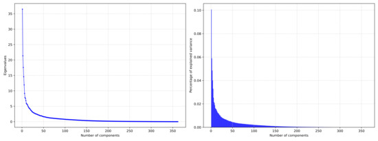 PCA was used to condense the information of linguistic indices and keep those that contribute the most to the variance. Scholars have indicated three standard methods for determining the number of principal components. The first method was an eigenvalue-based method, which followed the Kaiser–Harris criterion and retained components with eigenvalues greater than 1 [108]. The second method was Cattell’s scree test [109]. By plotting the eigenvalues and principal components, the curve of the scree plot was displayed, and the principal components above the maximum change were retained. The last method was the parallel analysis method [110]. A principal component was considered significant and retained for further analysis if its eigenvalue surpassed the corresponding average eigenvalue derived from a collection of random matrices. The decision on the number of principal components to retain was informed by this eigenvalue criterion, in conjunction with the insights gained from the initial two methods employed in the analysis. To ensure the correlation of the indicators contained in each principal component, only the absolute value of the eigen loading greater than 0.35 was included for further analysis [4].