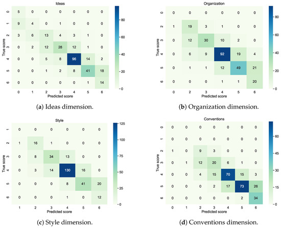 The confusion matrices for each rating trait, illustrated in Figure 4 and Figure 5, provided further insights into the accuracy of AES models, revealing the distribution of predictions across the scoring traits. These matrices are crucial for understanding where the model excels and where it may confuse certain score categories. With qualified micro-features, the proposed AES model not only achieves high accuracy but also aligns closely with the nuanced judgment of human raters across multiple dimensions of writing quality.