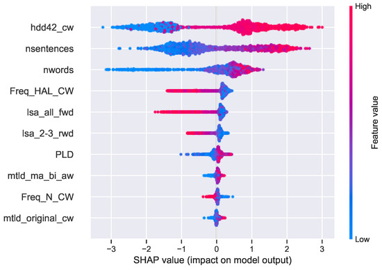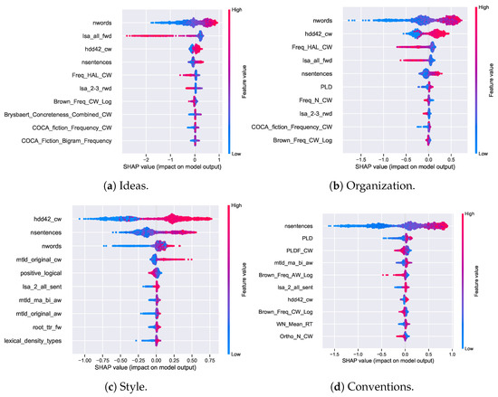 XAI with the SHAP model [29], underpinned by game theory principles, was utilized to clarify the impact of linguistic features on different constructs of writing quality. SHAP provides a coherent and theoretically sound approach for attributing the contributions of input variables to a model’s predictions. This method is distinguished by its capacity to illuminate the overall importance of features across the dataset and to offer detailed explanations for individual prediction instances. For each feature, SHAP values quantify its impact on the variance between the specific prediction and the dataset’s mean prediction. Furthermore, an analysis of SHAP values reveals the key features for each evaluative criterion, thereby enhancing the transparency and explainability of the proposed AES model. The summary plot uses the horizontal axis to display SHAP values, showing how each linguistic feature affects the model’s prediction: positive for enhancement and negative for detriment. The vertical axis ranks these features by their impact based on SHAP value aggregation. Color shifts from blue to red reflect the feature’s value in observations (blue for lower values, red for higher), offering a quick visual insight into the distribution and impact of feature values on the model’s output.