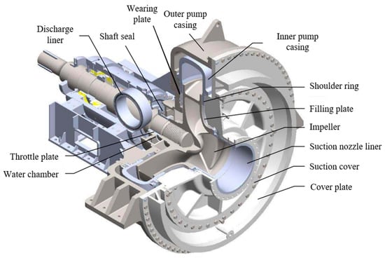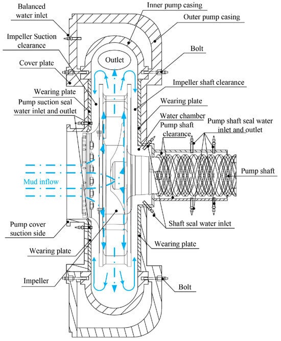 The mud pump studied in this study is a double wall centrifuge pump, including driving system, flushing system, lubrication system, water sealing system, and pressure and air control system. Its composition and structure are shown in Figure 1. The cover plate seals the suction side of the outer pump casing and is connected to the inner pump casing through bolts and nuts. Additionally, the impeller is installed in the inner pump casing, and the mud is transported through the rotation of the impeller. In addition, the impeller is connected to the pump shaft through a multi-thread thread, and the end of the pump shaft is connected to the coupling of the mud pump motor or gearbox, thereby driving the impeller to rotate. The MPWSS consists of an inner pump casing (including impeller and flow channel) and an outer pump casing (including water chamber and shaft seal). The outer pump casing connects the inner pump casing and the bearing body base and seals the inner pump casing from the shaft side. There is a pressure balance chamber between the inner and outer pump casings to ensure that the internal and external pressures are balanced and are the same as the working pressure of the mud pump.