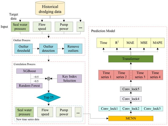 Based on the above literature review, the relative research on the reliability enhancement of mud pump is limited, especially the MPWSS. In the fields related to mud pumps, CFD (Computational Fluid Dynamics) simulation analysis is mostly used to improve the reliability of mud pumps. The difference in this article is that it focuses on the water sealing system of the mud pump, and uses machine learning and intelligent algorithms to predict the sealing water pressure required by the mud pump. These technologies have not yet been applied in MPWSS to address the security issues in mud pumps and protect them in dredging projects. Additionally, it is obvious that hybrid ensemble strategy and digital twin-driven approach can improve the prediction of sensor data effectively. However, the above-proposed model can be further optimized and improved. Most researchers adopt the prediction algorithm data directly, without considering that the prediction of data is essentially a regression problem, and the embedding layer of most models is not suitable for feature extraction in regression problems. Some researchers use CNN combined with the transformer model, but this can only be used for single-scale time series prediction and is not suitable for the corresponding regression prediction problems of multi-scale time series. Therefore, this research integrates multi-scale convolutional neural network (MCNN) and transformer models. The proposed MCNN-transformer model is applied in MPWSS and evaluated in comparison with six machine learning and deep learning methods. This method can thereby reduce the acceleration of wear at the mud pump shaft seal caused by sensor failure and improve the reliability of the MPWSS.