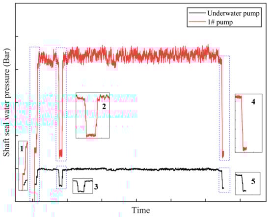 Before training the algorithm, it is necessary to filter out data from non-dredging operations and abnormal data, which can guarantee the efficacy of the training dataset. To achieve this, three rules are proposed for defining and distinguishing non-dredging operations and abnormal data: (1) Sensing parameters unrelated to dredging, including direction; (2) Data recorded during the start and end stages. Figure 4 illustrates the changes in the shaft seal water pressure of the underwater pump and 1# pump during the entire operation process. Specifically, subfigures 1 and subfigure 4 and 5 represent the start and end state of dredging respectively. It is worth to mentioning that the complete dredging process is divided into three stages: the initial stage, the operation stage and the finish stage. The initial stage and the finish stage belong to the non-dredging state, and their values transition from 0 to stable value and then back to 0. Thus, this part of the data can be removed; (3) Images 2 and 3 in Figure 4 are during the operation and the data theoretically belongs to the dredging operation stage, but their value changes suddenly and irregularly. Thus, this part of the value can be deleted or interpolated. To be more specific, in the algorithm of abnormal data processing, firstly, the upper and lower quartiles (Q1 and Q3) of each column of data were calculated. Then, the interquartile range (IQR) was calculated as Q1–Q3, and the threshold for outliers was defined as 1.5. Then, the lower and upper bounds for determining outliers were calculated as follows: