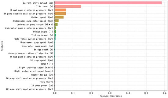Through conducting initial MPWSS key index selection filtering, relevant characteristic parameters can be preliminarily identified. Afterward, two intelligent algorithms Random Forest and XGBoost were combined, and the weights were set to 0.5 respectively [34,35]. This stacked model provides a more comprehensive assessment of feature importance and resolves the overfitting problem that may exist in a single model. Based on this stacked model, the 25 features with the highest comprehensive importance ranking are extracted, as shown in Figure 9. As can be seen from the figure, the parameter “Current shift output” has the highest correlation coefficient. This parameter indicates the current working status of the motor. Since there is a mechanical or hydraulic transmission relationship between the underwater pump and the motor, the greater the load on the motor, the greater the load on the pump and the output pressure may be higher, resulting in greater sealing water pressure required. The second most relevant parameter is “tide level”. The tidal water level changes periodically, so the output pressure of the underwater pump may also change periodically. When the tidal water level is high, the underwater pump requires a higher speed. To pump mud from deeper waters, higher sealing water pressures may need to be generated.