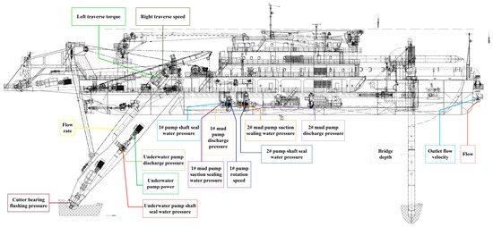 - The mud pump is the core device of the dredger operation. To prevent sediment from entering the pump shaft and causing damage during operation, the seal water pump, as depicted in Figure 1, injects water into the shaft and suction end of the mud pump. Water is injected into the pump shaft seal with specific pressure to ensure that the seal pressure exceeds the pump chamber pressure. Consequently, the seal water entering the mud pump from the pump shaft seal flows along the impeller clearance into the pump chamber, preventing mud from entering the impeller clearance and pump shaft seal. Additionally, a CSD typically includes at least one underwater pump, with larger CSDs featuring 1–2 additional pumps for pressurization. Therefore, the most relevant indices related to the mud pump are those generated by the pump itself. Finally, this study introduces “pump-related indices”, including suction vacuum, rotation speed, pump power, pump torque, shaft drive power, suction end seal water pressure, 1# pump and 2# pump shaft seal water pressure, and pump discharge pressure.