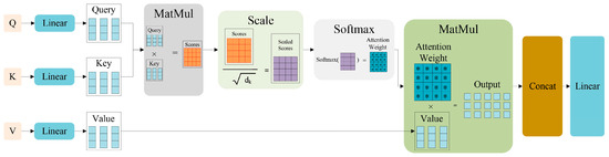 As shown in Figure 12, it is the framework of the multi-head attention mechanism. The multi-head attention mechanism is based on the self-attention mechanism. In the self-attention mechanism, the input is fed into three different fully connected Linear layers to create query, key and value. Query and key are multiplied by dot product matrix to generate a score matrix of scores. Then the scores matrix is processed, and the process can be expressed as Equation (7):