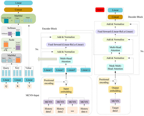 The transformer model was first proposed by Vaswani in 2017 [36]. The core idea of the Transformer model is to completely abandon the structure of the traditional recurrent neural network (RNN) and convolutional neural network (CNN), and instead apply the self-attention mechanism (self-attention mechanism). The Transformer model consists of two parts: the encoder and the decoder. Each layer contains a multi-head self-attention mechanism and a feedforward neural network, as depicted in Figure 12. The multi-head attention mechanism allows the model to pay attention to different semantic representation subspaces at the same time. Moreover, the transformer model also introduces positional encoding to process the position information of the sequence, as well as residual connection and layer normalization technology to stabilize the training process.