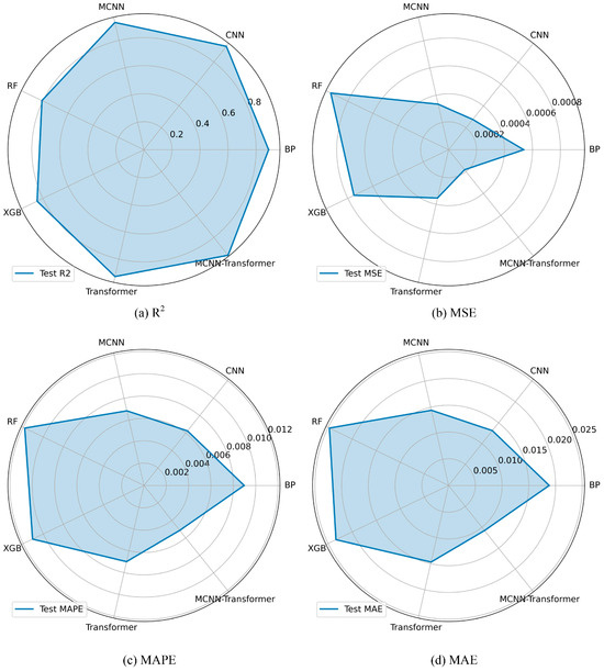 In addition, this study compares the hybrid model MCNN-Transformer with single models including MCNN, transformer, Random Forest, CNN, BP, and XGBoost. To assess the prediction performance of these models, four commonly used evaluation indexes, R2, MAE, MSE, and MAPE, are employed. Moreover, time is considered one of the evaluation criteria for assessing the timeliness of the models. The prediction results are presented in Table 2. Through observing and analyzing the evaluation indicators of the seven models, it is evident that the MCNN transformer model exhibits the highest coefficient of determination (R2), while the errors (MAE, MSE, MAPE) between the predicted and actual values are the smallest. In order to visually represent the relationship between the evaluation indicators of each model more intuitively, we have plotted the radar chart of these seven models, as shown in Figure 14.