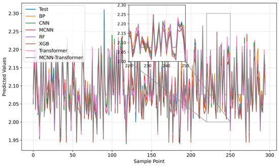 To further illustrate the experimental comparison results of the seven proposed models, Figure 15 shows the prediction curves of all models on the test set, Figure 16 shows the prediction curve of the MCNN transformer model, and Figure 17 shows the prediction curve of the remaining six models. By observing the partially enlarged picture, it can be clearly seen that the MCNN transformer model proposed in this study can fit the test data better. The parameters in the figure generally fluctuate within a certain range, indicating that the construction status of the mud pump is good and the soil properties are stable. A certain section is selected in the construction interval, select the parameters transmitted back by 25 dredger sensors are selected 700 data points from each parameter are used as the training set, and the remaining 300 data points are used as the testing set. Based on the above observations, it is shown that the integration strategy of using MCNN to convolve the input data and then input it into the Transformer is effective and can significantly improve the performance of a single Transformer model.
