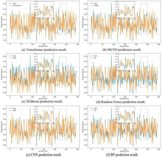 In order to verify the performance of the MCNN transformer model in predicting shaft seal water pressure, it was compared with the MCNN, transformer, RF, BP and XGBoost prediction models. For the MCNN transformer model, the MCNN method is employed to process various types of input data. Through multi-layer convolution operations, it captures features from the time series data. The extracted time series features are then enhanced and transformed to improve feature representation and the model’s generalization ability. Additionally, the MCNN model reconstructs the time series data and converts them into the input format processed by the embedding layer of the Transformer model.