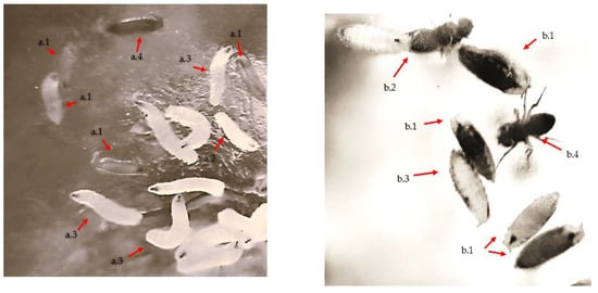 The research evaluated and quantified the larva (III)-pupal-adult transition, the number of larval stage III (Figure 2(a.3)), the number of pupae (including newly hatched ones, Figure 2(a.4)), and the number of emerged adults (Figure 2(b.2,b.4)). Recently hatched (10–12 h post-hatch []) D.m. adults (Figure 2) were transferred in a 5:5 ratio (♀-virgin: ♂) for fertilization and oviposition for 24 h in dishes (125 mL) with culture medium (20 g), after which they were removed from the medium.