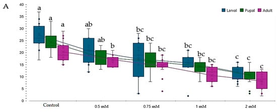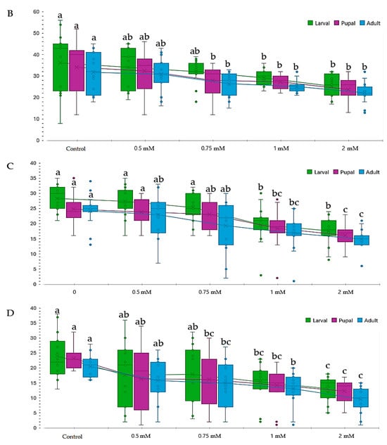 Effect of lead on different genotypes of Drosophila melanogaster (D.m.): (A)—wild genotype (Oregon-R), (B)—brown mutant genotype, (C)—white mutant genotype, (D)—vestigial white mutant genotype. Notes: The different superscript letters (a–c) indicate significant differences (p < 0.05), with “a” representing the best.
