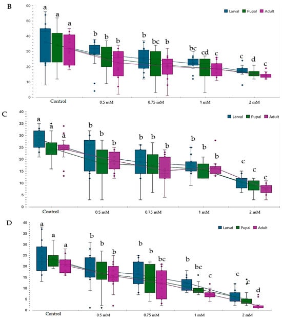 Effect of copper on different genotypes of Drosophila melanogaste (D.m.): (A)—wild-type genotype (Oregon-R), (B)—brown mutant genotype, (C)—white mutant genotype, (D)—white-vestigial mutant genotype. Notes: The different superscript letters (a–d) indicate significant differences (p < 0.05), with “a” representing the best.