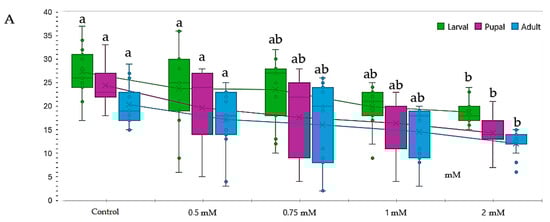 Comparatively, our results suggest that Cu2+ effects impact more then Pb2+, with a greater reduction in adult number. This pronounced effect of Cu2+ over Pb2+ was also observed in plants []. This result may be understandable in itself, as copper (CuSO4) is often used as an antimicrobial and antibacterial agent, playing a homeostatic role, whereas lead accumulation presents a markedly different toxicological profile.
