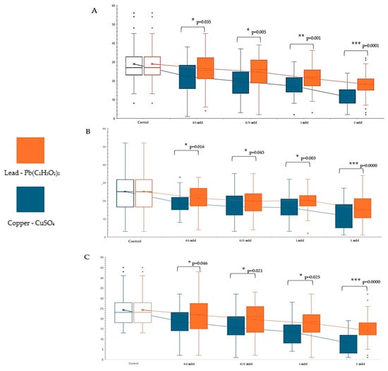These discrepancies persisted across other concentrations, indicating the prevailing dominance of copper toxicity over lead toxicity. Consequently, the level of significance escalated with increasing concentration. Thus, at a concentration of 1.00 mM, copper’s toxicity was significantly more pronounced (p < 0.05) than lead. At 2.00 mM, the significance level escalated to p < 0.0001. These intervals were markedly different from each other (Figure 5) and also from the control. These findings underscore a more acute toxic effect of copper compared to lead.
