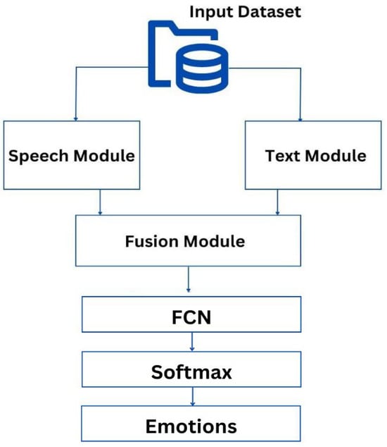 Figure 1 illustrates how the proposed method harnesses the potential of both the speech and text modalities for emotion recognition. This approach acknowledges the rich and complex information conveyed through spoken words, as well as the nuanced meanings captured in written text. By integrating these modalities, the method aims to achieve a more comprehensive and accurate understanding of emotional states. It leverages the strengths of both the speech and text analyses, potentially improving the efficacy of emotion-recognition systems. Specifically, emotional expressions extracted from both text and speech are introduced into a fusion module. The output derived from the fusion module is subsequently introduced into an FC layer. This step allows the consolidation of high-dimensional multimodal features. The final part of this process includes the application of a softmax layer, which computes the probabilities corresponding to different emotions. Each component of the emotion-recognition pipeline is explored in detail in the following subsections.