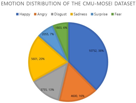 The CMU-MOSEI dataset is an extensive multimodal compilation of conversational video data dedicated to emotion recognition. This dataset includes more than 23,000 video fragments extracted from 1000 distinct sessions involving over 1200 contributors. The video entries are accompanied by speech transcripts, auditory and visual characteristics, and labels signifying varying degrees of valence and arousal. The CMU-MOSEI dataset classifies emotions into six categories: anger, happiness, sadness, disgust, fear, and surprise. The dataset encompasses a wide variety of emotional samples: anger (4600), sadness (5601), disgust (3755), surprise (2055), happiness (10,752), and fear (1803) as depicted in Figure 5. This variety ensures a comprehensive representation of emotional states, facilitating a more robust and accurate analysis in subsequent emotion-recognition studies.