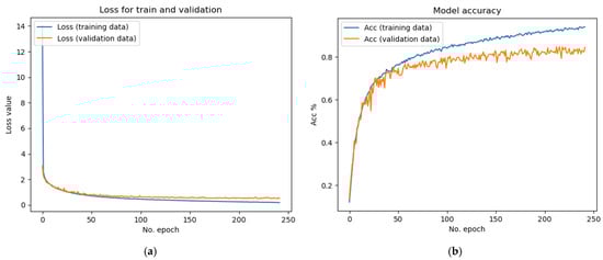 Training and validation Loss (a) and accuracy (b) performances on the CMU-MOSEI dataset.