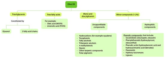 The metabolites present in olive oil have been the subject of extensive research, owing to their fundamental relevance to health. Studies have identified clear benefits of this important component of the MD in protecting against chronic and degenerative diseases, which can be attributed to its metabolites [13]. Olive oil extraction involves collection, cleaning, extraction, separation, centrifugation, storage, and packaging. However, to obtain higher-quality oil, namely virgin olive oil (VOO), no heat or chemicals can be used, because it is directly obtained from the olive only through mechanical processes under specific thermal conditions that do not cause alterations. VOO is rich in phenolic compounds and has an acidity level of ≤2 g per 100 g [14,15]. EVOO has the highest quality and lowest acidity level of 0.8 g per 100 g [15]. The main components of olive oil are triacylglycerols, free fatty acids, mono- and diacylglycerols, and in a reduced percentage, there are highly bioactive minor compounds (Figure 1) [16]. In subsequent sections, the health benefits of the key metabolites are described.