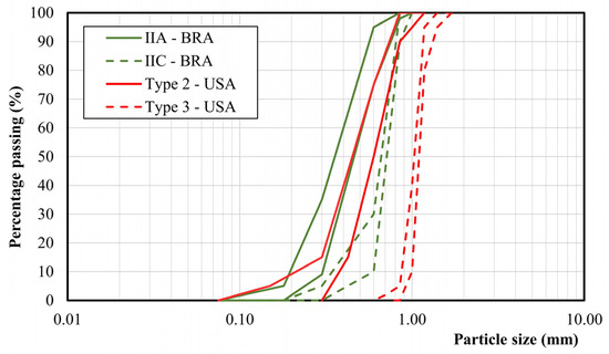 Grain size distribution ranges of glass beads IIA and IIC from NBR 16184 (BRA) [21] and Type 2 and Type 3 from AASHTO M247 (USA) [22].
