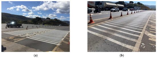 Experiments on highways require special attention because they involve several safety aspects. The experiment used the lines transversal to traffic as recommended by NTPEP [28]. This experimental setup presents the following advantages: all stripes can be placed close together in a short length of highway, which allows for the quick measurement of retroreflectivity; all materials are subjected to the same conditions of traffic and weather; and all the stripes are hit by vehicles, which accelerates the experiment. Although transversal stripes do not represent the real condition of markings, since they are applied longitudinally [5], transversal stripes provide similar results to overall pavement markings’ degradation [29,30]. Figure 3a shows one example of the test site on the day of application and Figure 3b shows the stripes after being subjected to traffic for 11 months.