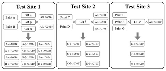 Each experimental test site used different paints, glass beads, and glass bead application rates (ARs), which generated several material combinations, as shown in Figure 4. All the paints were applied with a wet thickness of 500 µm, and no anti-skid was used.