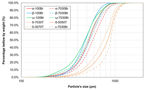 The size distributions of the glass beads (Figure 5) present a large variation due to their gradations or manufacturers. The glass bead compositions δ-7030T, δ-5050T, and δ-3070T present larger particles than the other compositions. Regarding the other compositions, β-100Br and ω-100Br present the smallest particles, but all the compositions present similar size distributions.