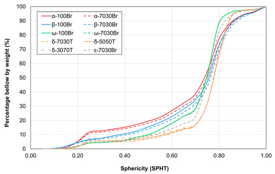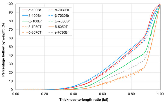 The distributions of the thickness-to-length ratio (b/l) in Figure 6 show that compositions δ-7030T, δ-5050T, and δ-3070T present the same distribution of thickness-to-length ratio, with around 78% of round particles (b/l higher than 0.85), as required by AASHTO R98 [26]. The compositions ε-7030Br and ω-100Br present 70% and 65% of particles with b/l higher than 0.85, while the other compositions present less than 50% of round particles.