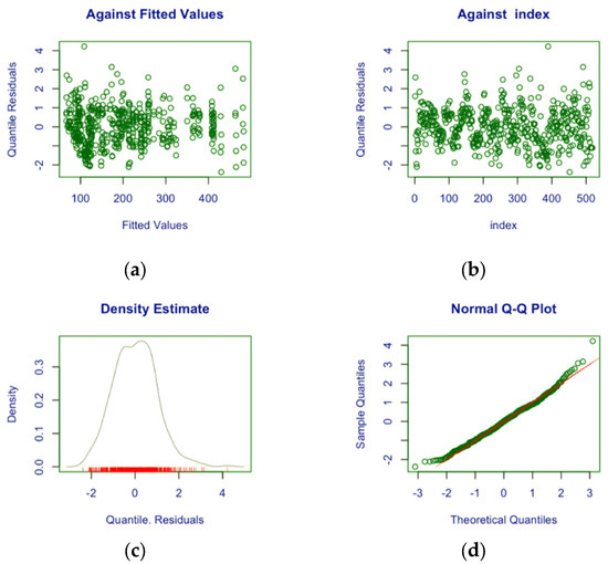 To validate the adequacy of the fitted model, a residual analysis was run, and Figure 8 presents the diagnostic plots of the normalized randomized quantile residuals [41]. The diagnostic plots in Figure 8 show that there is no violation of the model assumptions, and the residuals are normally distributed, confirming the adequacy of the fitted data to the model.