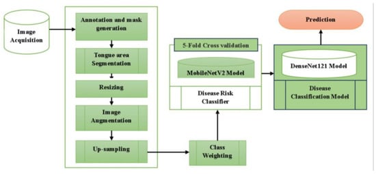 Our pipeline combines two different types of image classification methods: a binary classification for normal or diseased tongues and a disease label classifier for multilabel annotated images. The AUCMEDI [] platform is employed to develop our classification model; in both cases, we are using pretrained models to reduce the time and cost of training a fresh model. We apply transfer learning with frozen layers, with the exception of the classification head. After 10 epochs of training, the freezing is undone so that the weights can be adapted to the new task.