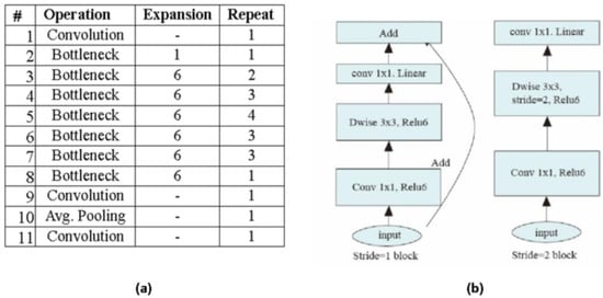 Each block has three different layers, consisting of point-wise 1 × 1 convolution and 3 × 3 depth-wise convolution. There are Stride 1 blocks and Stride 2 blocks, as shown in Figure 2b. Bottleneck is either an inverted residual block, a bottleneck residual block, or a Stride 1 or Stride 2 block. Bottleneck layers enhance models’ ability to transition from lower-level pixels to higher-level variables identifying image categories.