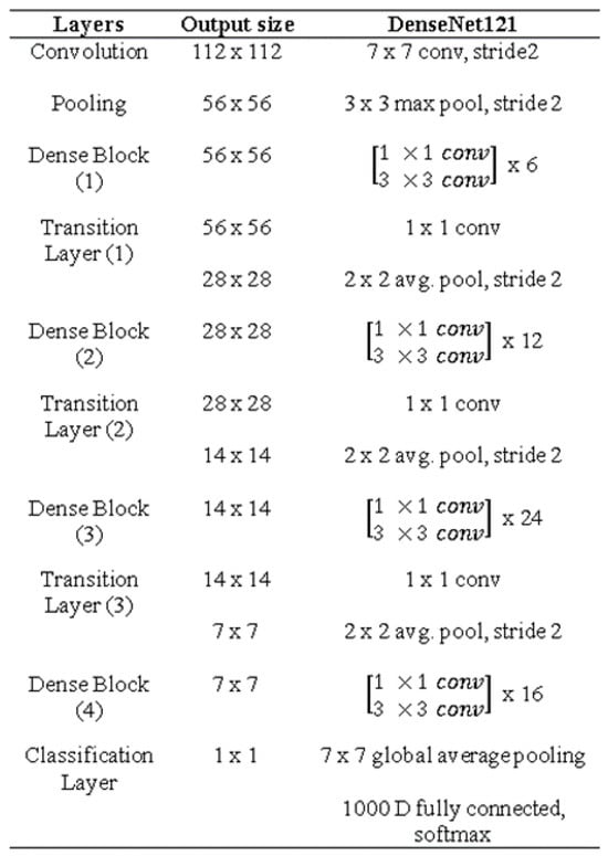 where x0 represents the input, Hl represents the non-linear transformation occurring in each block, and xl represents the output of the Lth layer. A transition block, consisting of a convolution and pooling layer, follows each dense block. Lastly, the dense block is terminated by a classification layer that accepts the feature map of all previous layers of the network to perform the classification task. Bottleneck layers are used within each block, where 1 × 1 convolution reduces the number of channels in the input, followed by 3 × 3 convolution for feature extraction. This helps to relax large computational requirements while also improving efficiency. DenseNet-121 consists of four dense blocks with [6,12,24,16] number of layers in each block as shown in the summary chart in Figure 3.