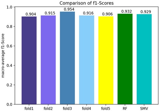 The Soft Majority Voting Ensemble aggregates the generated predictions from the five folds to create a new prediction matrix. The category with the maximum value is considered the final prediction for each sample. In this particular case, the ensemble of 5-fold predictions with two classes does not show enhanced performance; F1 scores for Random Forest and Soft Majority Voting are comparable to the individual fold F1 score as depicted in Figure 5.
