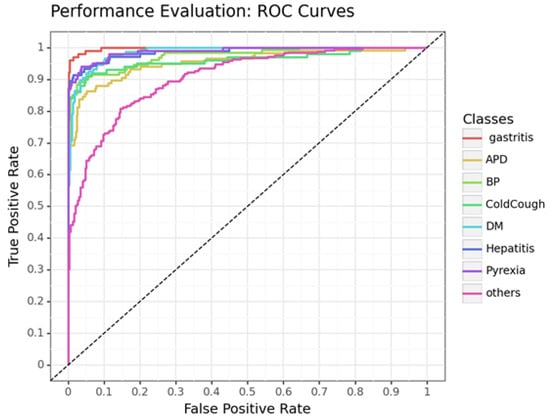 The DenseNet-121 model is utilised for the classification of diseases. The dataset comprised seven distinct disease labels and an additional one, which consisted of all diseases with fewer than 10 subjects in each category. Model training stopped at 41 epochs. The disease classification model with DenseNet-121 architecture took over 18 h to train. Table 4 shows the performance parameters for the eight labels considered in the test data of 474 images. The ROC curve in Figure 6 gives an idea of true positive predictions for each category.