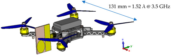 Each element of the FDVA consists of an elliptic patch antenna assembled on a quadcopter drone, as shown in Figure 1. The maximum size of the drone is 131 mm. The parts of the drone consist of metal and carbon fiber. The antenna is strategically located on the side of the drone to focus the radiation on the front.