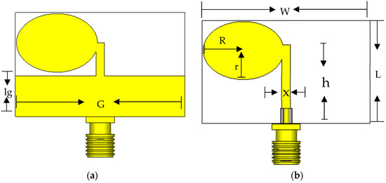 where θ is the elevation angle, and the wave number is defined as k = 2π/λ with λ as the wavelength in the initial frequency f0. The variable xn is the element position in space. The term fn is the frequency offset concerning f0. The difference between frequency offsets is ∆fn = (fn − fn−1). The variable d is the distance variable. The term d0 is the distance between the array and the maximum radiation. The constant c is the velocity of light in a vacuum. The function g(θ) is the element pattern of the nth antenna in the frequency f0. This function considers the pattern distortion due to the aircraft structure depicted in Figure 1. The elliptical patch antenna is shown in Figure 2. The antenna material is an FR4 substrate of 1.6 mm thickness, with a permittivity of εr = 4.3, a tangential loss of δ = 0.0025, and a copper layer of 0.04 mm. The physical dimensions are W = 37.5 mm, L = 25 mm, G = 37.5 mm, R = 9 mm, r = 6.5 mm, h = 17.6 mm, x = 1.9 mm, and lg = 9 mm. The antenna parameters were calculated based on the theory reported in [36]. It should be noted that the radiation pattern of the FDVA was simulated in the CST microwave studio. The reflection coefficient is shown in Figure 3; this antenna operates from 3.25 GHz to 3.79 GHz. We selected this element because it is low profile, which is an important characteristic when the antenna is mounted on a drone. Nevertheless, the drone can use a different antenna element. The selection of the best antenna for a frequency diversity virtual array is an open research topic.