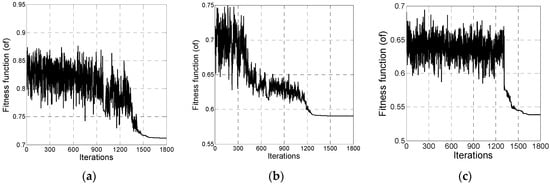Fitness function during the optimization: (a) N = 6, (b) N = 9, and (c) N = 12.