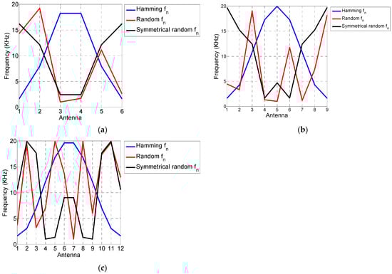 Radiation of a VAA with N = 12: (a) random without symmetry, (b) random with symmetry, and (c) Hamming distribution.
