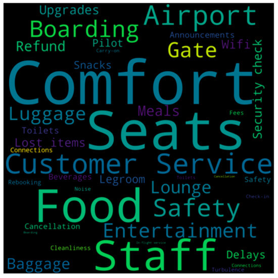 Figure 2 offers a visual representation of the predominant aspect words extracted from customer reviews, presented through a word cloud. This visualization method not only highlights the relative frequency of each term by adjusting its font size but also serves as an immediate visual summary of passenger priorities and concerns. The prominence of certain aspects within the word cloud indicates their frequent mention across the dataset, suggesting that addressing these areas could significantly enhance customer satisfaction. By focusing on these high-frequency terms, airline service providers can align their service improvements more closely with customer expectations. Furthermore, this word cloud enables quick identification of the most discussed service aspects in passenger reviews, providing actionable insights that are supported by quantitative data analysis. These insights are essential for management to effectively prioritize resource allocation toward areas that will most improve service quality.
