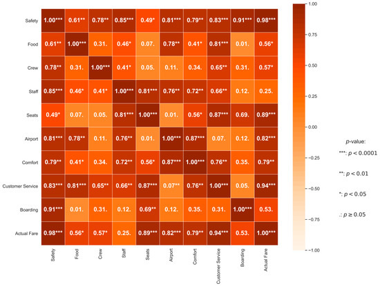 Similarly, Figure 4 reveals crucial insights such as the extremely significant correlation between safety and actual fare (r = 0.98 ***), suggesting that perceptions of safety could significantly influence fare decisions. This implies a customer’s willingness to pay a premium for perceived higher safety standards. The correlation between the boarding process and safety (r = 0.91 ***) further supports the notion that efficient boarding procedures enhance passengers’ overall impressions of airline safety. Moreover, the correlation between comfort and class of service (r = 0.87 **) supports the expectation that higher service classes are linked to increased comfort, enriching the customer’s travel experience.