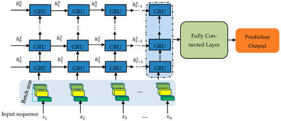 Moreover, a series of GRUs with shared parameters can be concatenated and stacked into a network of multiple layers so as to be used for sequence prediction tasks. Figure 6 shows the architecture of such a network, which is typically called the GRU model. In Figure 6, the input sequence comprises a sequence of feature vectors: , , , and . As a sequence of data flows into the network, each GRU layer processes the sequence, updates the hidden state sequentially at every time step , and passes the outputs to the next layer. This stacked configuration allows for capturing complex patterns in timeseries data. When used for the task of sequence-to-one prediction, the outputs in the last time step are fed into a fully connected layer, which integrates the learned representations and performs the final prediction of classification or regression tasks.