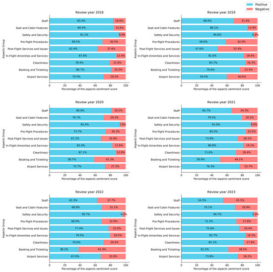 Figure 8 shows the yearly ABSA results presented based on the nine aspect groups from 2018 to 2023. The two colors signify the ratios of the positive and negative sentiments within the customer reviews for each aspect group denoting distinct service dimensions. Across the years, the persistence of positive feedback in certain categories, such as safety and security, suggests favorable passenger feedback or effective service strategies, while the presence of negative sentiment, such as post-flight services and issues, suggests unfavorable passenger feedback and the need for ongoing attention and enhancement. The depiction of sentiment analysis across the consecutive years enables tracking the long-term changes in customer perception and could provide invaluable insights for strategic planning or operational adjustments aimed at elevating the customer journey.