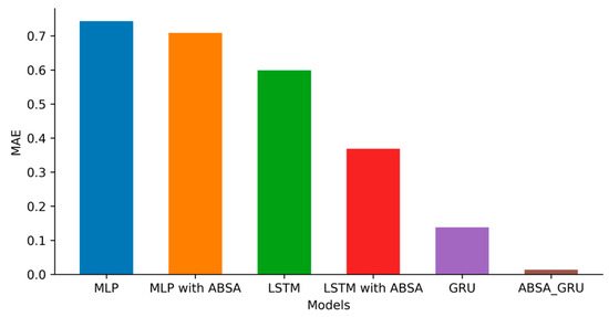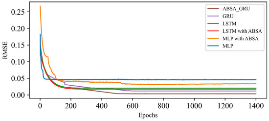 Further detailed in Figure 10 is an RMSE analysis over 1400 epochs, where the ABSA_GRU model consistently outperformed others, maintaining a low RMSE, indicative of stable data trend representation. In contrast, the MLP model exhibited a higher RMSE, highlighting the significant error reduction when ABSA is applied.