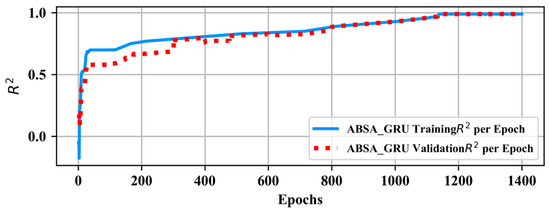 Further extending the analysis, Figure 12 compares the R2 values of the proposed ABSA_GRU model over the same training epochs. The model shows progressive accuracy improvements, with R2 values nearing 1 for both training and validation sets. This consistent performance indicates a high reliability in fare prediction when ABSA is utilized, with R2 improvements highlighting the substantial benefits of integrating passenger feedback into the predictive models.