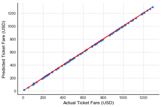 Figure 13 further shows how well the ABSA_GRU model predicts flight ticket fares. On the scatter plot, the x-axis shows the actual fares, and the y-axis displays the predicted fares. The closer the data points are to the red diagonal line, the more accurate the predictions are. It can be seen in Figure 13 that most of the model’s predictions align well with the line, indicating that the model accurately predicts the flight ticket fares. The small differences from the ideal line show that the model is generally reliable across various fare ranges. The consistent efficiency of the ABSA_GRU model is evident regardless of whether the ticket fares are low or high. Its RMSE value is low, which means there is only a small difference between the predicted value and the actual fare. The performance metrics for various models are summarized in Table 7.