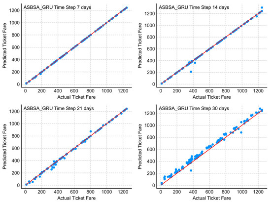 Furthermore, a comprehensive assessment was carried out across several timeframes to ascertain the effectiveness of the GRU model with ABSA. The evaluations encompassed prediction of varying durations, ranging from short-term to long-term, and were conducted at 7, 14, 21, and 30 days. Table 8 shows the predictive accuracy of this model over these time intervals. The results in Table 8 reveal that the model demonstrates high precision in the 7-day horizon, with an RMSE of 0.0072 and an R2 of 0.9769, indicating its accuracy in forecasting flight ticket fares over one week. In the 14-day timeframe, the model maintains this robustness, evidenced by an RMSE of 0.0078 and an R2 of 0.9181. However, there is a noted slight decrease in accuracy for medium-term predictions. Over 21 days, the model begins to show instances of deviation, but most predictions still align closely with the actual values. The increase in RMSE to 0.0671 and the decrease in R2 to 0.8246 highlights the growing impact of external and inherent uncertainties on prediction efficiency. For the interval of 30 days, the model exhibits more noticeable variations in its predictions, particularly with higher fares. The RMSE of 0.0881 and an R2 of 0.8143 indicate the challenges in accurately predicting fares over a longer period. Despite the potential drop in performance over extended periods, the model still demonstrates a considerable degree of predictive capability. Figure 14 shows the model’s predictive accuracy over these time intervals.