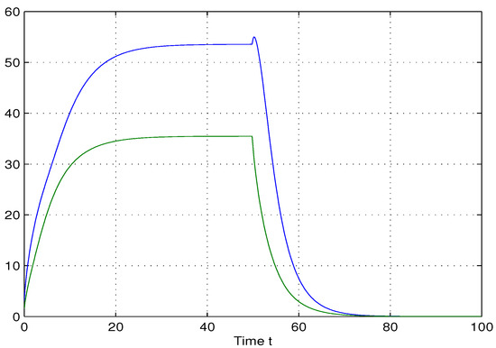 This makes it possible to compress the evolution of the 2D system using 1D plots. It can be seen in Figure 1 that and go to zero as goes to infinity, indicating that the system is stable.