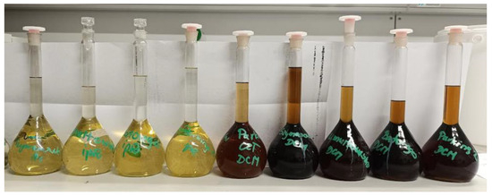 Snow, along with contaminants, was dissolved on a filter (and the remaining sediment was rinsed with iPrOH (extract 1); then, the same sediment was washed with DCM (extract 2). The obtained fractions were concentrated in order to determine the concentrations of dissolved particles, and then solutions of equal concentrations were prepared from them (Figure 2).