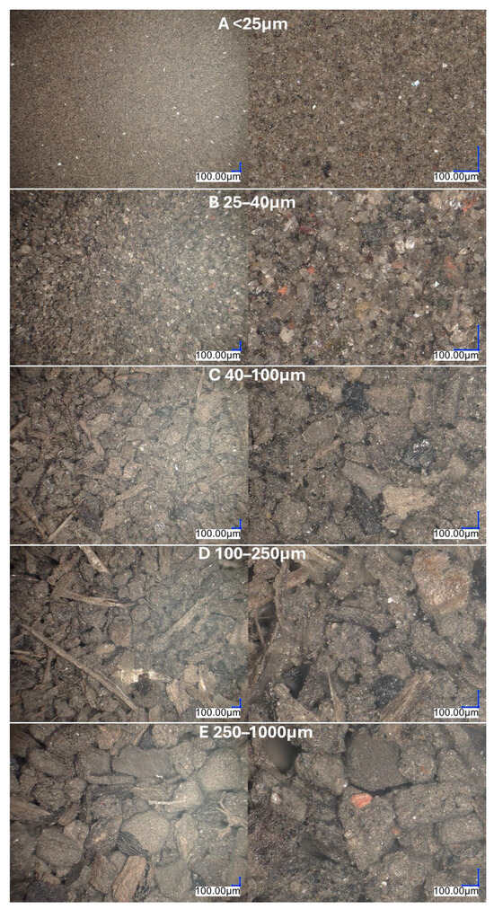 To preliminarily ascertain the composition of individual fractions post-extraction, microscopic images of the acquired sediments were captured using an optical microscope (Figure 3). The analysis revealed that sand was predominant in all fractions. Fractions containing particles within the range >40 μm (Figure 3C–E) exhibited the presence of organic matter (such as plant fragments, etc.). Additionally, dark artifacts observed in the microscopic images were identified as iron particles.